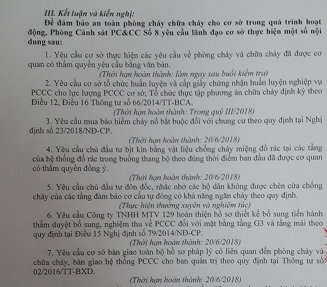 Biên bản kiểm tra của Phòng Cảnh sát PCCC số 8 chỉ ra hàng loạt tồn tại ở Chung cư 129