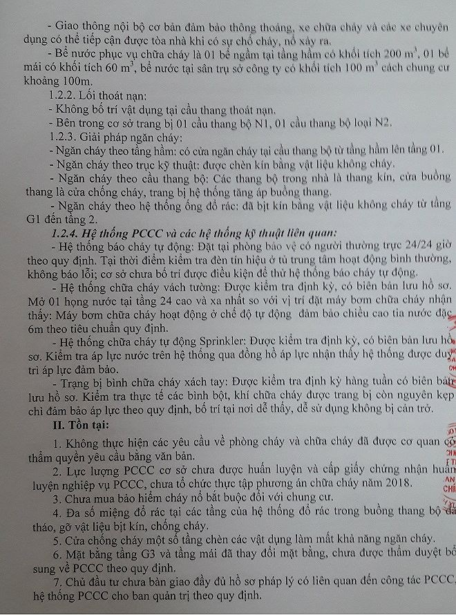 Đa số miệng đổ rác tại các tầng của hệ thống đổ rác trong buồng thang bộ đã tháo, gỡ vật liệu bịt kín, chống cháy. Cửa chống cháy một số tầng chèn các vật dụng làm mất khả năng chống cháy. Mặt bằng tầng G3 và tầng mái đã thay đổi, chưa được thẩm duyệt bổ sung về PCCC theo quy định. Chủ đầu tư chưa bàn giao đầy đủ hồ sơ pháp lý có liên quan đến công tác PCCC, hệ thống PCCC cho Ban quản trị theo quy định.