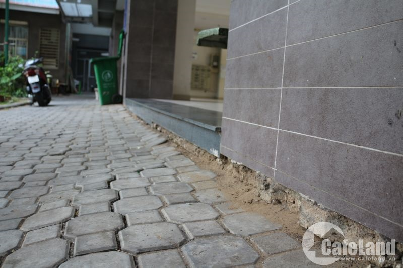 Chỉ tay vào một vị trí nền bị sụt lún, một cư dân tại Block A2 cho biết, lúc mới dọn vào nền gạch lát sân cao gần bằng với mặt nền nhà tuy nhiêu theo thời gian thì nền gạch sụt lún càng sâu.