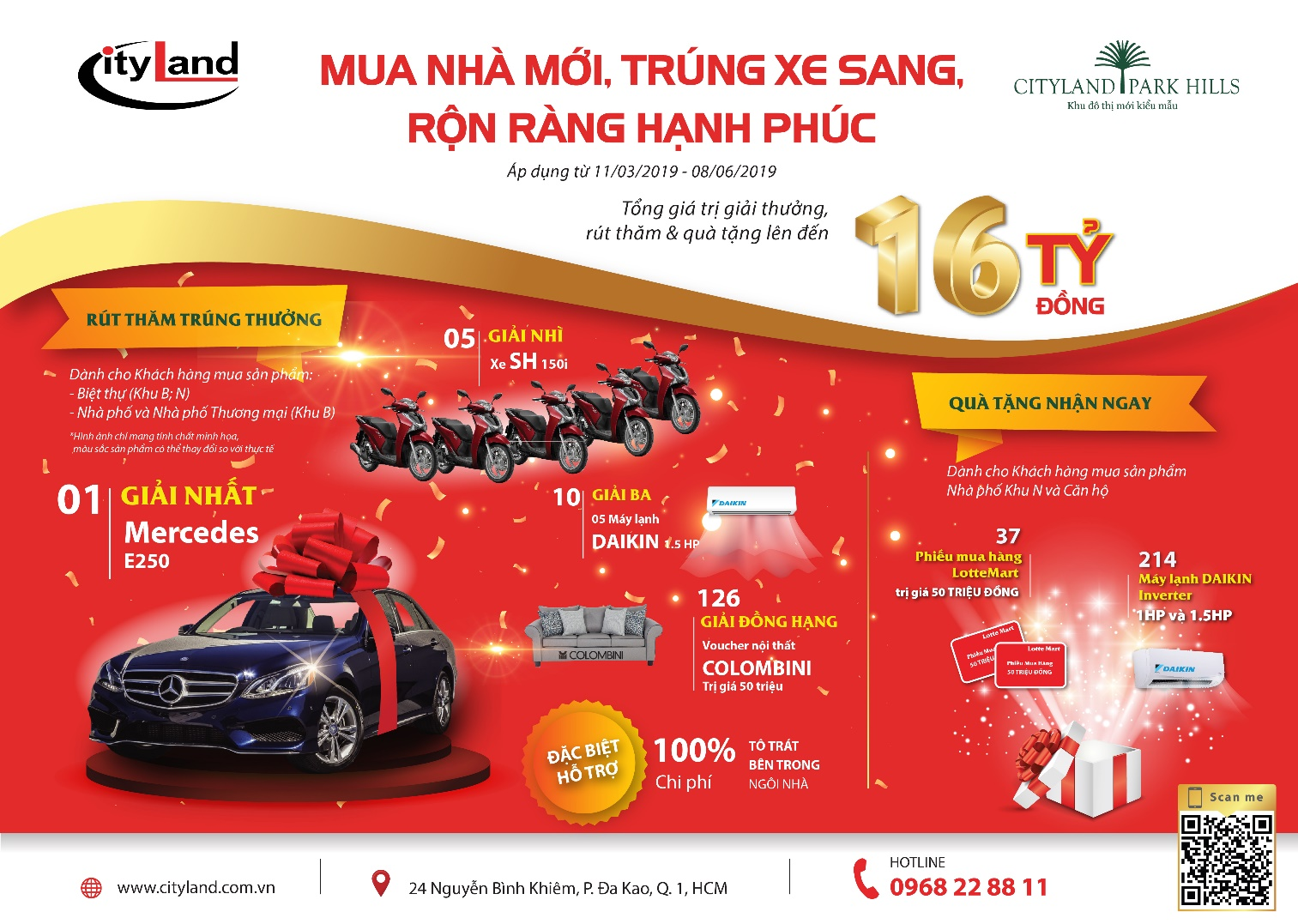 Từ nay đến 8/6, khách hàng mua nhà CityLand Park Hills có cơ hội trúng thưởng ôtô Mercedes E250 2,6 tỷ đồng cùng nhiều quà tặng đến 16 tỷ đồng.