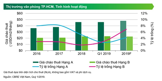 Mặc dù nguồn cung khan hiếm nhưng giá thuê văn phòng của hai phân khúc A và B đều ổn định hơn so với năm 2018. Đặc biệt phân khúc hạng B lại tăng nhẹ 0,5% so quý trước với giá thuê là 23,44 USD/m2/tháng, tăng 0,5% so với quý trước.