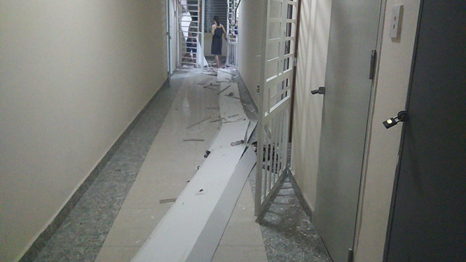 Phần thạch cao đổ xuống nằm ngổn ngang dọc lối đi, rất may thời điểm xảy ra vụ việc không có người qua lại hành lang.