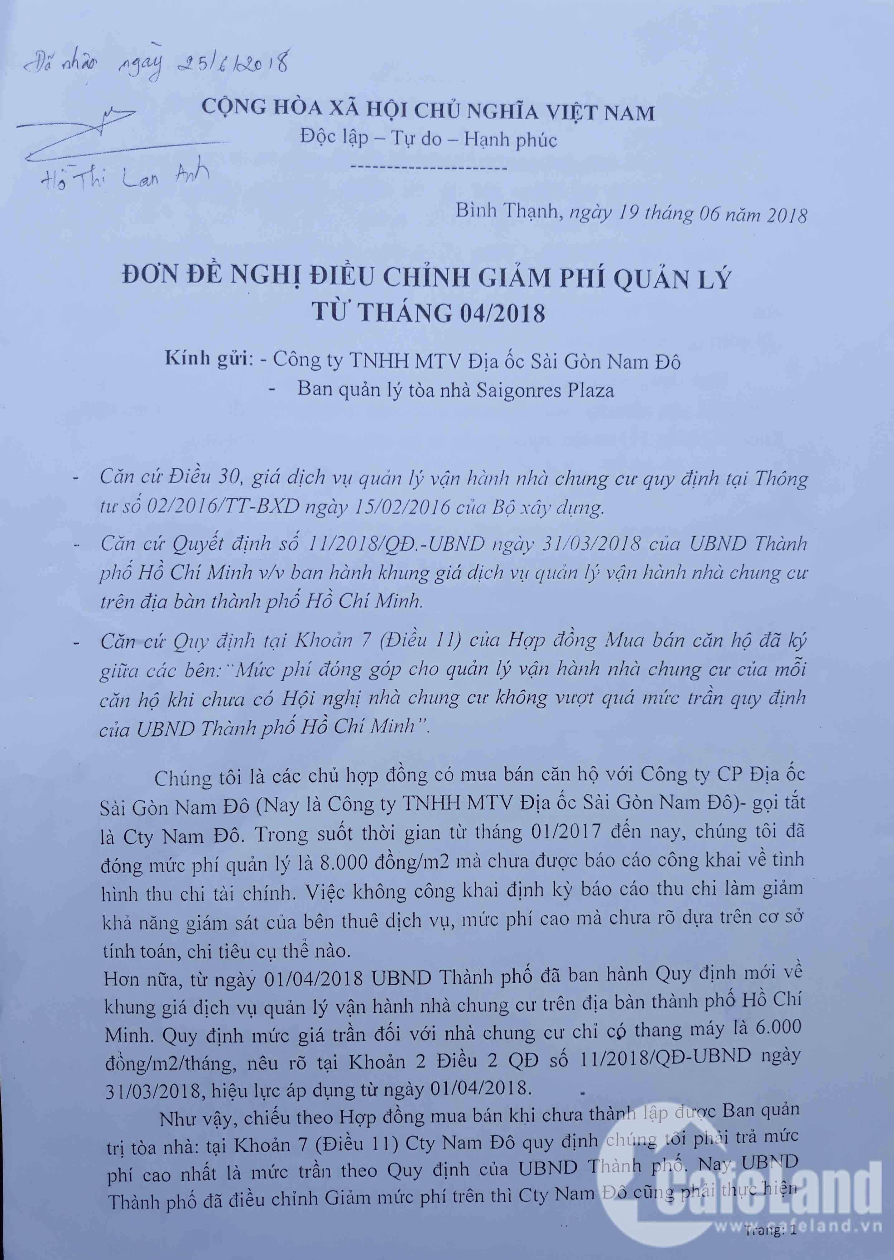 Đơn đề nghị điều chỉnh mức phí của các hộ dân gửi chủ đầu tư.