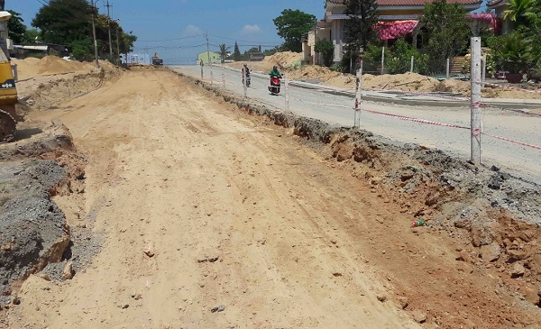 Theo thiết kế, bề rộng con đường 15m, vỉa hè rộng 5m, hạ tầng đầy đủ hệ thống điện chiếu sáng, cống thoát nước... Thế nhưng hiện nay, đường được thi công nham nhở, một bên đào sâu, một bên đổ đá dăm.