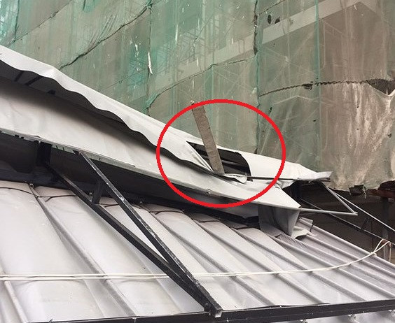 Thanh sắt từ công trình TMS Luxury Hotel Đà Nẵng rơi xuống, xuyên thủng mái tôn nhà bên cạnh. Ảnh: Nguyên Vũ.