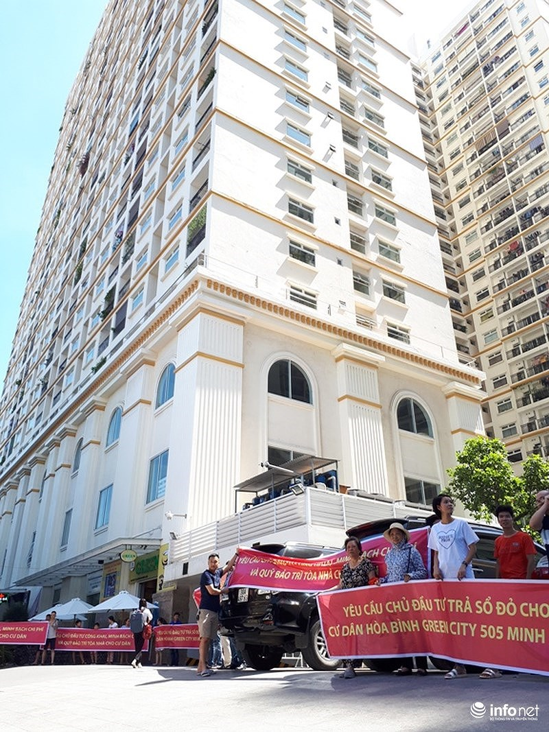 Nhằm yêu cầu chủ đầu tư là Công ty TNHH Hòa Bình (ông Nguyễn Hữu Đường giữ chức Chủ tịch HĐQT) phải có câu trả lời cho cư dân mua nhà tại Dự án Hòa Bình Green City ở 505 Minh Khai (Hai Bà Trưng, Hà Nội) về thời hạn cấp sổ đỏ, minh bạch các chi phí quản lý và quỹ bảo trì của cư dân để đảm bảo chất lượng dịch vụ của tòa nhà đúng với những cam kết khi mua nhà, việc thành lập Ban quản trị…. sáng 1/7, cư dân tại khu chung cư đã cùng nhau tập trung căng băng rôn nói rõ kiến nghị của mình với chủ đầu tư.