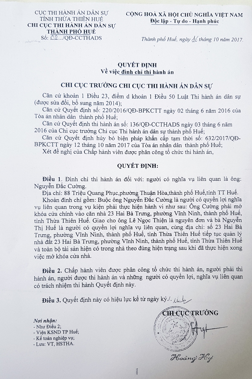 Công văn đình chỉ áp dụng biện pháp khẩn cấp của Chi cục Thi hành án dân sự thành phố Huế sau án sơ thẩm, nhưng ông Nguyễn Đắc Cường vẫn bị vô hiệu quyền làm chủ tài sản thuộc quyền sở hữu của mình.