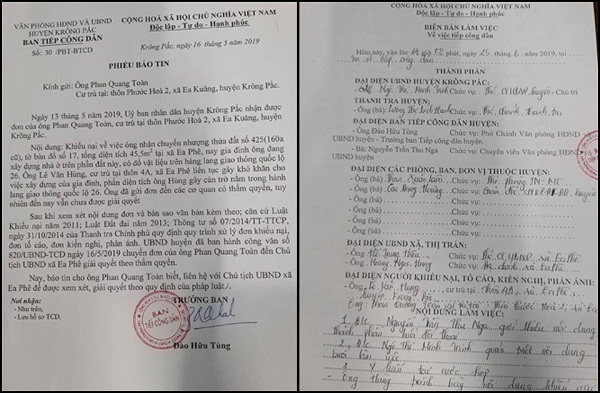 Trong cuộc làm việc tại Trụ sở Tiếp công dân huyện Krông Pắk vào ngày 25/6/2019 liên quan đến việc tranh chấp, khiếu kiện giữa ông Phan Quang Toàn và ông Lê Văn Hùng, bà Ngô Thị Minh Trinh - Phó Chủ tịch UBND huyện Krông Pắk đề nghị ông Toàn và ông Hùng thỏa thuận với nhau. Nếu không thỏa thuận được thì hai bên tiếp tục có quyền kiện vấn đề tranh chấp này ra tòa án.