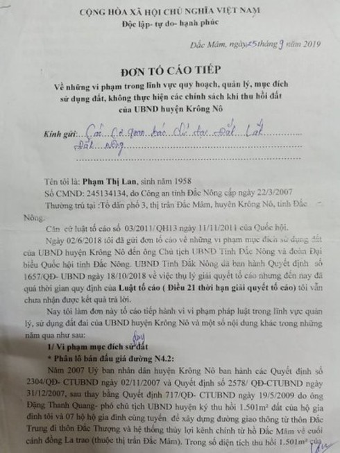 Đơn tố cáo của bà Lan gửi các cơ quan báo chí