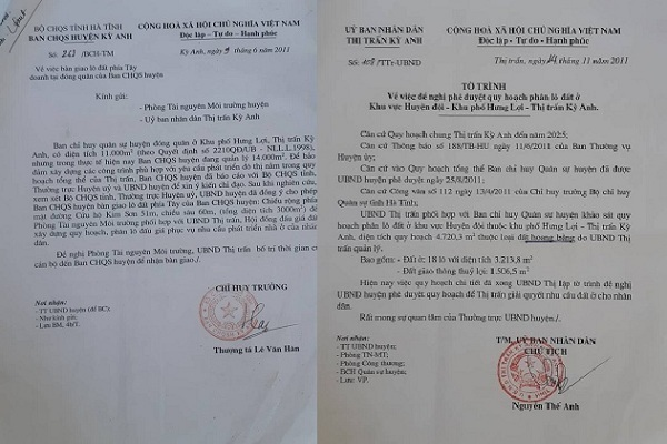 Văn bản Ban chỉ huy Quân sự huyện Kỳ Anh giao đất và tờ trình của UBND thị trấn Kỳ Anh đề nghị huyện Kỳ Anh phê duyệt phân lô đất ở