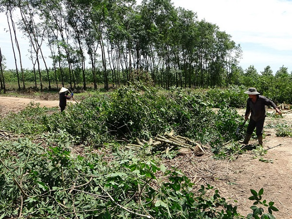 Công nhân đang thanh lý cây cao su, bàn giao đất cho chính quyền xây dựng khu tái định cư. Ảnh: Lê Lâm