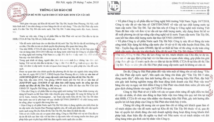 Liên quan đến vấn đề này, trước đó Hải Phát đã phát đi thông cáo báo chí, cho rằng nước sinh hoạt cho cư dân ở khu đô thị do Công ty cổ phần đầu tư công nghệ môi trường Việt Nam cung cấp. Đây là đơn vị cấp nước duy nhất tại địa bàn này vào thời điểm đó.