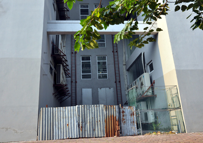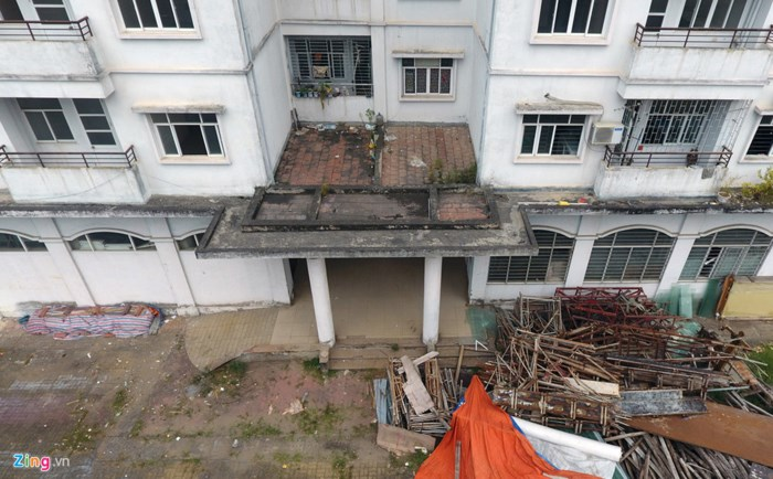 Do bị bỏ hoang nhiều năm nay nên nhiều khu vực của tòa nhà đã được trưng dụng cho những mục đích khác, vật liệu nằm ngổn ngang chắn cửa tòa nhà (Ảnh: Zing)