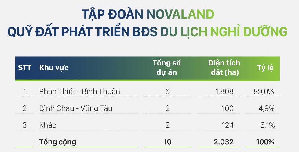 Hiện Novaland đang phát triểu dự án Đại Đô thị Du lịch Nghỉ dưỡng Giải trí NovaWorld Phan Thiết, tọa lạc tại xã Tiến Thành, Phan Thiết, Bình Thuận, dự án có quy mô 1.000ha cùng đa dạng các sản phẩm để đầu tư như nhà phố, biệt thự nghỉ dưỡng (second-home), nhà phố thương mại (shophouse) với tầm nhìn hướng ra khung cảnh biển.