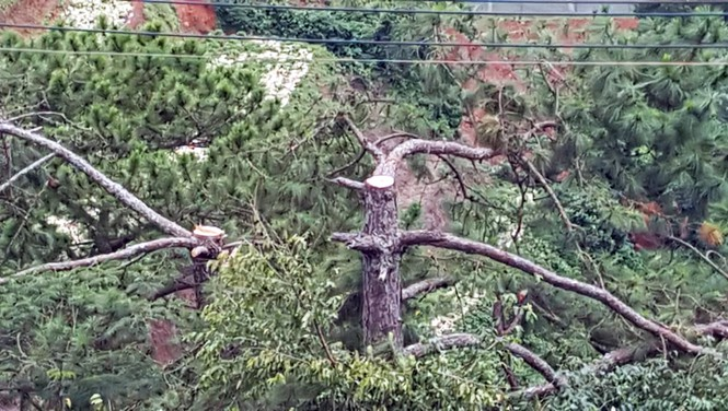 Cũng tại hiện trường, đường điện trung thế 22kV đang đi theo đường thẳng đã bị “uốn” thành hình chữ Z để né lô đất của bà Vinh và hậu quả là 2 trong số 3 cây thông khoảng 60 năm tuổi hiếm hoi còn sót lại tại khu vực này bị cưa ngang thân để thi công đường điện khiến dư luận bức xúc.