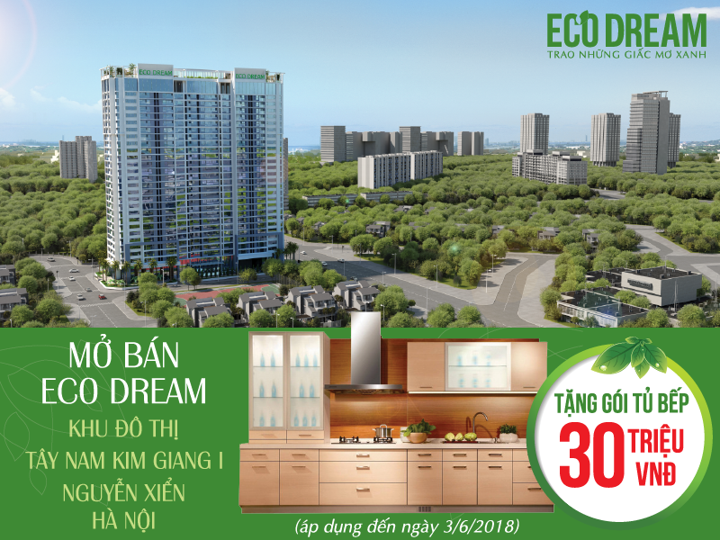 Theo chính sách mới ban hành, khi mua căn hộ tại dự án Eco Dream (thuộc KĐT Tây Nam Kim Giang I, Nguyễn Xiển, Hà Nội), khách hàng sẽ được tặng gói tủ bếp trị giá 30.000.000 đồng/căn, áp dụng cho các căn hộ 3 phòng ngủ và 20.000.000 đồng/căn đối với căn hộ 2 phòng ngủ. Đặc biệt, khách hàng thay vì nhận quà tặng bằng hiện vật, chủ đầu tư sẽ trả bằng tiền mặt trừ trực tiếp vào giá trị căn hộ. Như vậy khách hàng sẽ chủ động lựa chọn thiết kế tủ bếp cho phù hợp với sở thích của mình. Chương trình áp dụng cho những khách hàng mua căn hộ Eco Dream từ ngày 03/05/2018 đến hết ngày 03/06/2018.