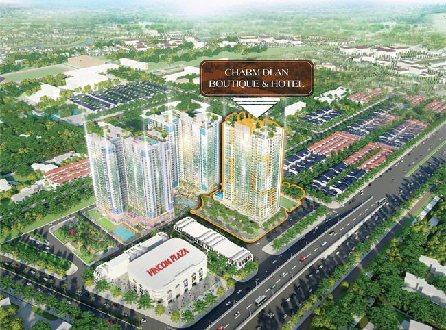 Mức giá khoảng 40 triệu/m2 nhiều khả năng sẽ thuộc về tòa khách sạn 4 sao Charm Dĩ An Boutique Hotel, thuộc block Charm Diamond - cao 35 tầng với hơn 500 phòng của tập đoàn DCT Group.
