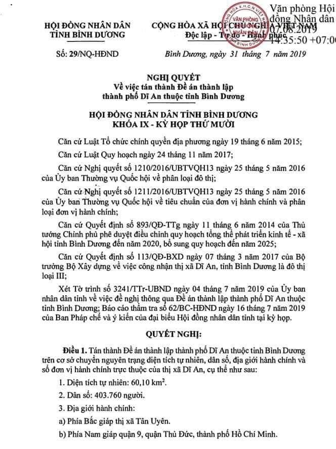 Đặc biệt, ngay thời điểm hiện tại, chủ tịch HĐND Tỉnh Bình Dương, đã chính thức phê duyệt nghị quyết đề án thành lập TP Dĩ An, thuộc tỉnh Bình Dương theo đề xuất của UBND tỉnh.