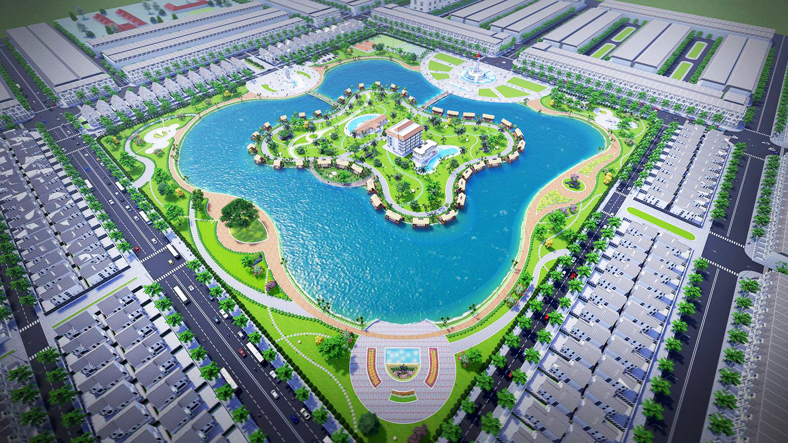 Tổng thể dự án và phối cảnh công viên trung tâm nhìn từ trên cao