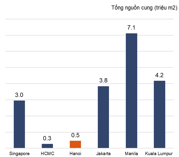 Mặc dù tổng nguồn cung văn phòng cao cấp của Hà Nội vẫn trong đà tăng tiến nhưng chưa bằng 20% nguồn cung của các thành phố trong khu vực như Kuala Lumpur, Singapore hay Manila.