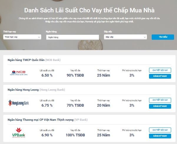 Danh sách lãi suất vay: Homedy cung cấp thông tin hơn 60 gói cho vay vốn mua nhà/đất của các ngân hàng trên thị trường dựa trên phần trăm lãi suất, hạn mức và thời gian vay vốn tối đa. Với tiện ích này, người dùng sẽ không cần phải tốn nhiều thời gian để đi tìm hiểu mức lãi suất vay của từng ngân hàng. Thay vào đó, chỉ cần nhập nhu cầu vay vốn như thời hạn vay, lựa chọn ngân hàng và sắp xếp lãi suất theo thời gian, Homedy sẽ giúp bạn tìm ngân hàng cho vay phù hợp nhất.