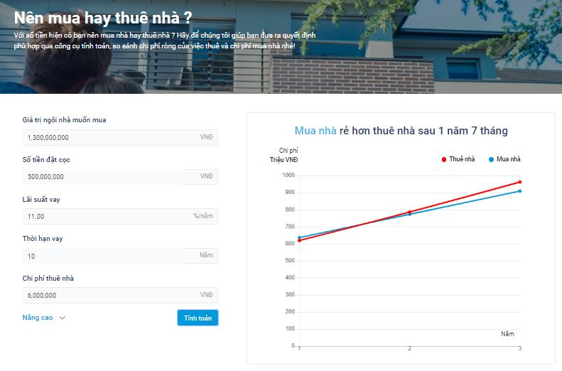 Mua hay thuê nhà: Tính năng này cho phép bạn so sánh chi phí ròng của việc thuê và chi phí mua nhà. Từ đó, đưa ra quyết định nên mua hay nên thuê nhà tại thời điểm nào cho thích hợp nhất.