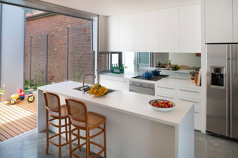 Cách tốt nhất để mang thêm ánh sáng cho căn bếp nhỏ hẹp nhà bạn là sử dụng gạch tráng gương hay những cửa sổ bằng kính.