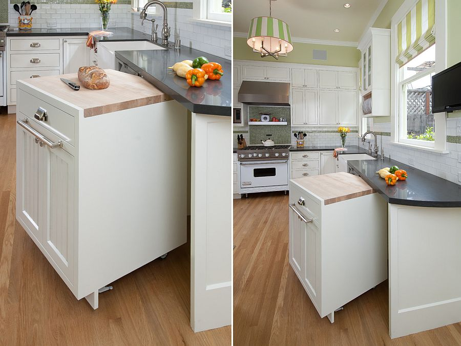 Hầu hết các nhà bếp hiện đại ôm lấy hòn đảo thông minh dù chúng nhỏ đến đâu. Thay vì đảo bếp thông thường, hãy chọn một chiếc trên bánh xe mang lại cho nhà bếp một sơ đồ sàn thích ứng. Các đảo có thể được di chuyển xung quanh một cách dễ dàng và trong một số thiết kế, có thể được giấu bên dưới kệ bếp khi không sử dụng.