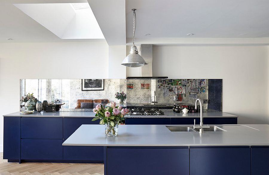 Cửa sổ trên trần nhà cùng gương phản chiếu làm mới không gian nhà bếp từng tối và nhàm chán này.