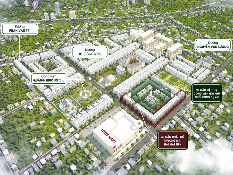 Phối cảnh vị trí đắc địa 43 căn nhà phố thương mại sở hữu 2 mặt tiền đường Nguyễn Văn Lượng và 28 căn biệt thự có công viên nội khu cuối cùng tại khu B dự án CityLand Park Hills. Thông tin chi tiết truy cập www.cityland.com.vn hoặc hotline 0968228811.