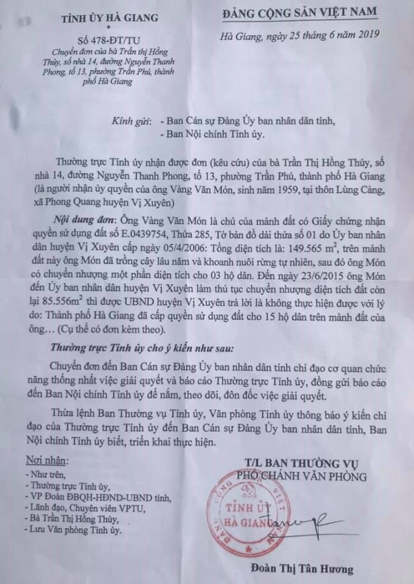 Liên quan đến vụ việc của ông Món, ngày 25/6/2019, Tỉnh ủy Hà Giang cũng đã có Văn bản số 478-ĐT/TU gửi Ban Cán sự Đảng UBND tỉnh và Ban Nội chính Tỉnh ủy, chỉ đạo các cơ quan chức năng thống nhất việc giải quyết và báo cáo Thường trực Tỉnh ủy, đồng thời gửi báo cáo đến Ban Nội chính Tỉnh ủy để nắm, theo dõi, đôn đốc việc giải quyết.