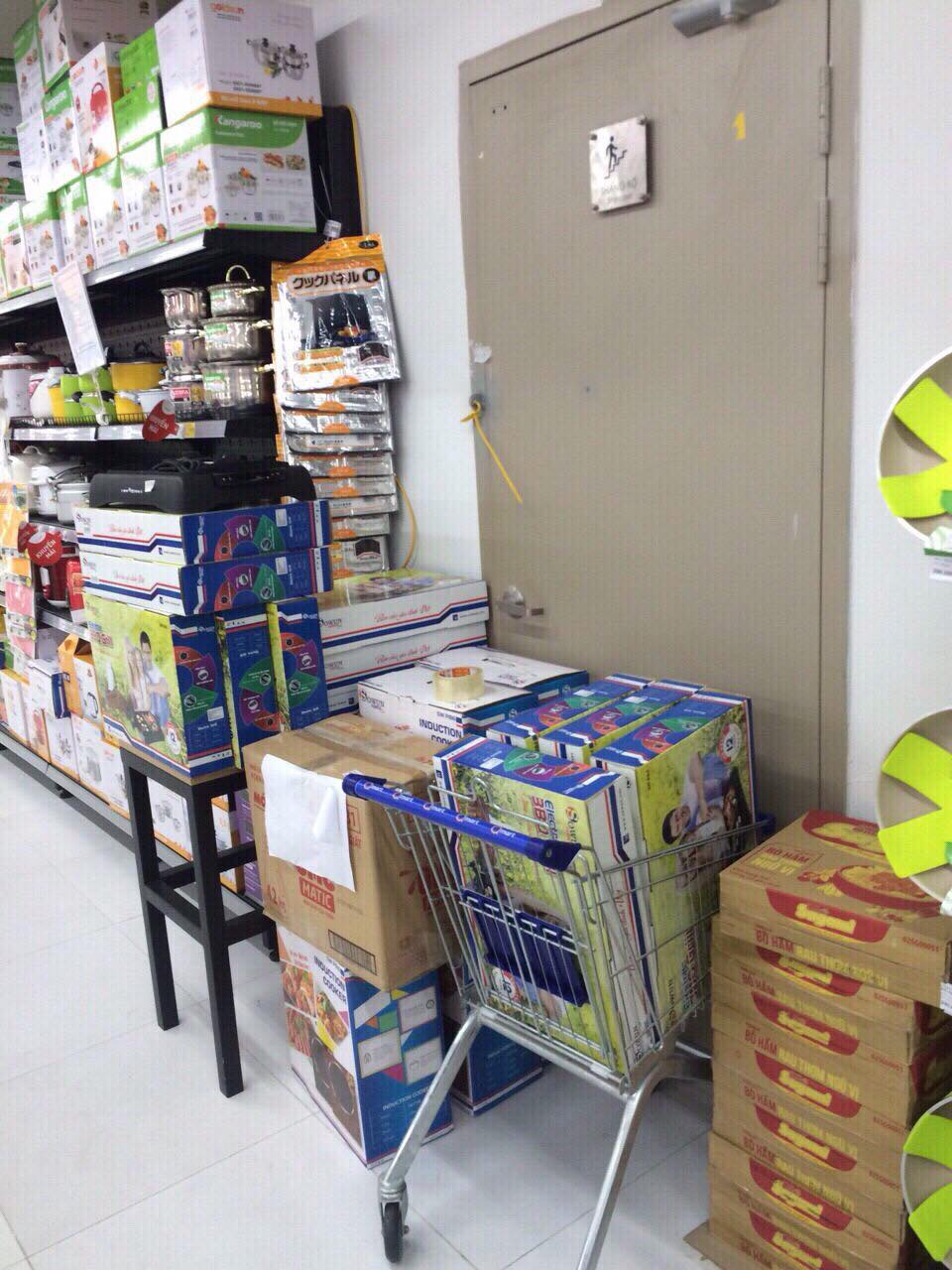 Sau khi có ý kiến, dù cửa không còn khóa nhưng vẫn nằm trong siêu thị. Đến 10h khi siêu thị đóng cửa mà xảy ra hỏa hoạn thì cư dân sẽ thoát hiểm đường nào? (Ảnh Châu Anh)