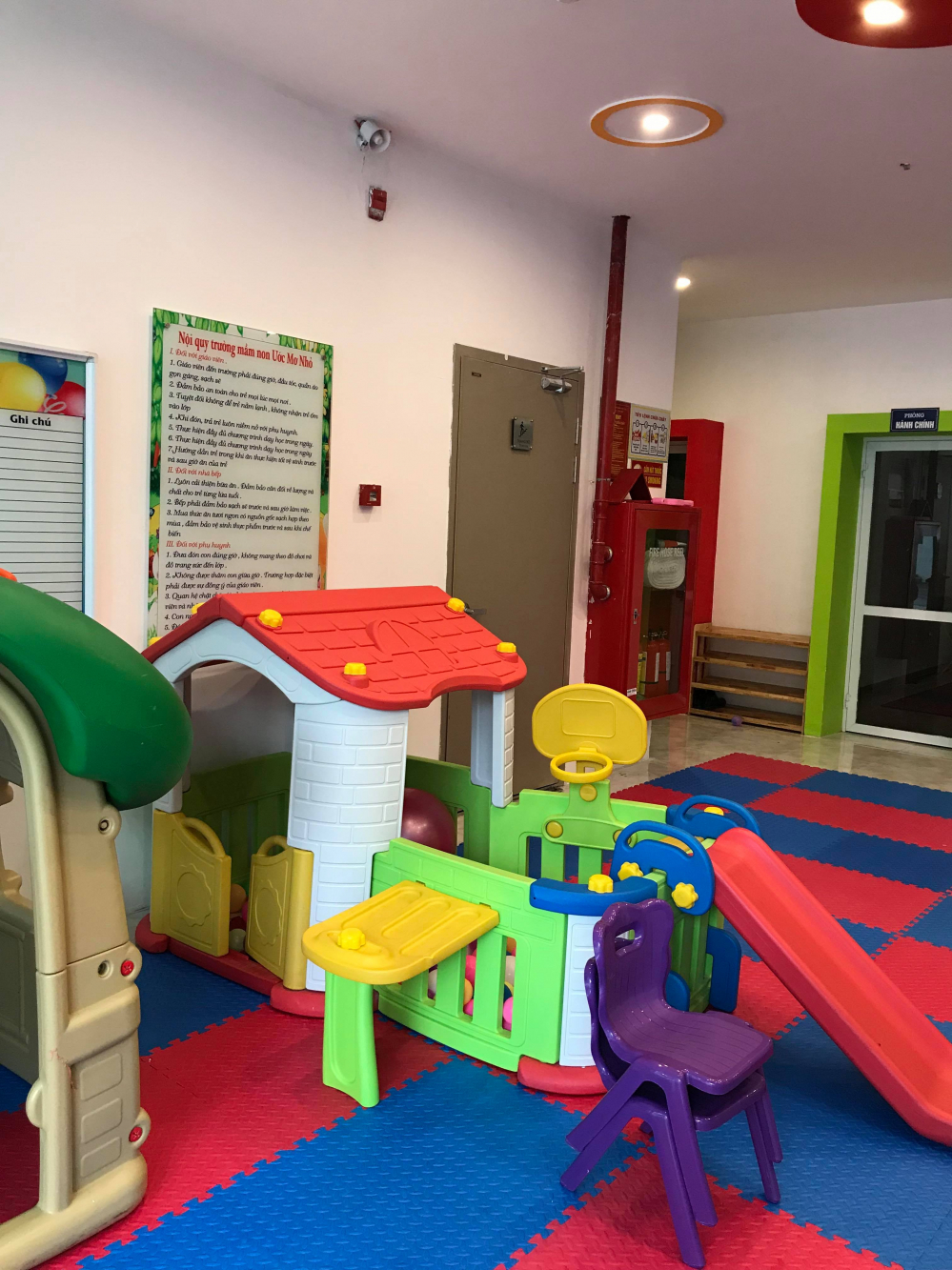 Cửa thoát hiểm tại tầng 1 tòa C nằm trong khu vực trường mầm non. Dù cửa thoát hiểm này được thiết kế dành riêng cho 2 tầng này, nhưng lối thoát hiểm lại có rất nhiều đồ chơi, thảm cỏ nhân tạo, đều là những vật dễ cháy, không đáp ứng được tiêu chuẩn kỹ thuật dành cho khu vực cửa thoát hiểm.