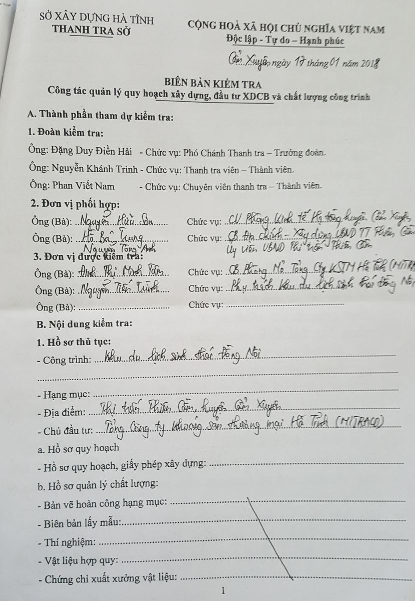 Thanh tra Sở xây dựng Hà Tĩnh lập biên bản về những sai phạm tại Dự án Khu du lịch sinh thái Đồng Nôi
