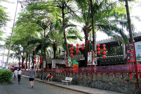 Tương tự công viên Phú Lâm, công viên Bình Phú ở đường số 10 (Q.6) cũng là nơi vui chơi, giải trí của người dân địa phương. Tuy nhiên, nhiều năm nay công viên này cho một số doanh nghiệp thuê đất kinh doanh, trong đó nổi bật nhất là nhà hàng, cà phê có tên gọi 7 Kỳ Quan ở số 12, đường 26 được giới thiệu có tổng diện tích xây dựng tới 4.000 m2 và tổng sức chứa lên tới 1.200 khách. Ghi nhận của PV, khuôn viên của nhà hàng chạy sâu vào phía bên trong công viên Bình Phú.