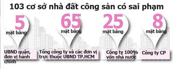 Niên độ thanh tra, kiểm tra một số cơ quan, đơn vị trên địa bàn trong 2 năm 2016 - 2017, Thanh tra TP.HCM có 10 kết luận, phát hiện đến 103 cơ sở nhà đất công sản có sai phạm. Cụ thể, về chủ thể quản lý là UBND quận, đơn vị hành chính có 5 mặt bằng; Tổng công ty và các đơn vị trực thuộc UBND TP.HCM: 65 mặt bằng (trong đó Tổng công ty nông nghiệp Sài Gòn: 32 mặt bằng, Tổng công ty văn hóa Sài Gòn: 19 mặt bằng, Tổng công ty du lịch Sài Gòn: 14 mặt bằng); Công ty 100% vốn nhà nước: 25 mặt bằng (trong đó Công ty dịch vụ công ích Q.8: 14 mặt bằng, Công ty dịch vụ công ích Q.6: 2 mặt bằng, Công ty Sakyno: 2 mặt bằng, Lực lượng TNXP: 7 mặt bằng); Công ty CP: Công ty Bình Phú: 1 mặt bằng, Công ty CP văn hóa Phương Nam: 7 mặt bằng.