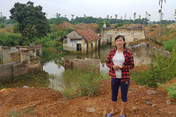 Vén con đường đất lầy lội, chị dẫn chúng tôi men theo một con dốc. Con dốc ấy, chính là khu đất đổ nền làm khu tái định cư mà thành. Đi chừng hơn trăm mét là ngôi nhà tường gạch khá kiên cố, nhưng không thể bước vào vì khoảng sân gạch bây giờ đã thành ao, đàn vịt thi nhau ngụp lặn…