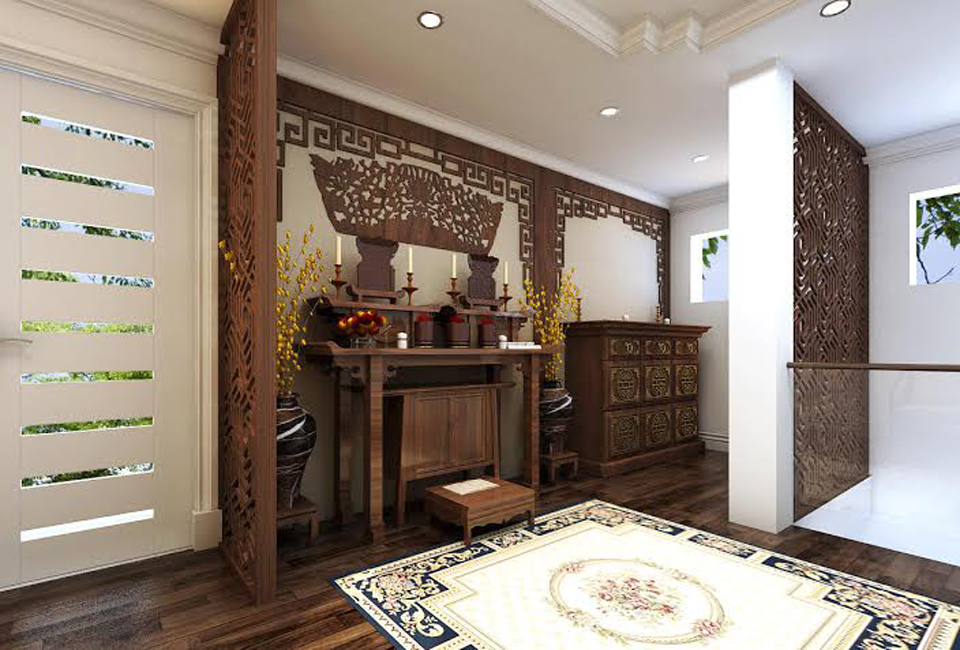 - Bày trí bàn thờ đối diện cửa ra vào, nếu thỏa mãn về phương vị và hướng thì là cách bài trí tốt về phong thủy, không gian phòng thờ cần thể hiện sợ tôn nghiêm;