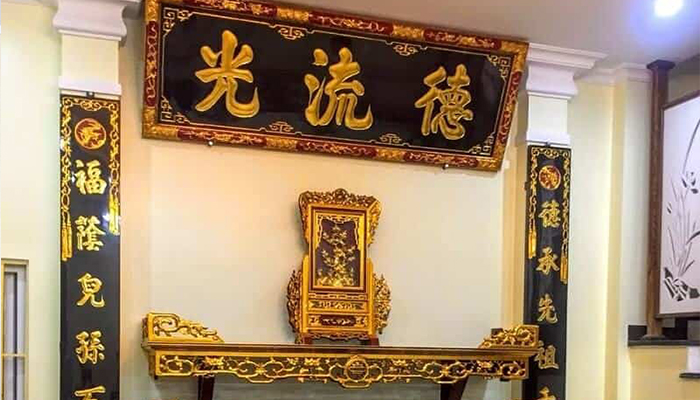 - Sát vách đặt một Ngai Thờ có bài vị Cửu Huyền Thất Tổ (hoặc bài vị của cụ cao nhất bàn thờ gia tiên đang thờ phụng) hoặc đặt Khám Thờ có cửa mở ra đóng lại với bên trong đặt các bài vị tổ tiên, chính giữa viết hai chữ Thần Chủ;