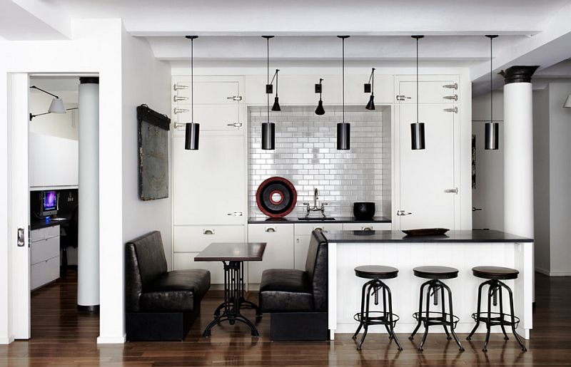 Cân bằng sử dụng màu đen và trắng trong nhà bếp nhỏ và phong cách.