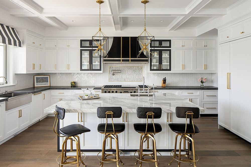 Vàng thêm lấp lánh cho nhà bếp trong màu đen và trắng.
