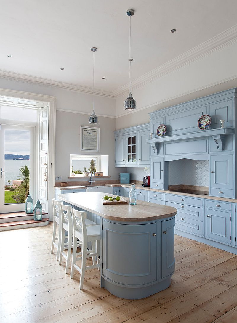 Tủ và đảo mang một sắc thái nhẹ nhàng của màu xanh cho nhà bếp màu trắng.
