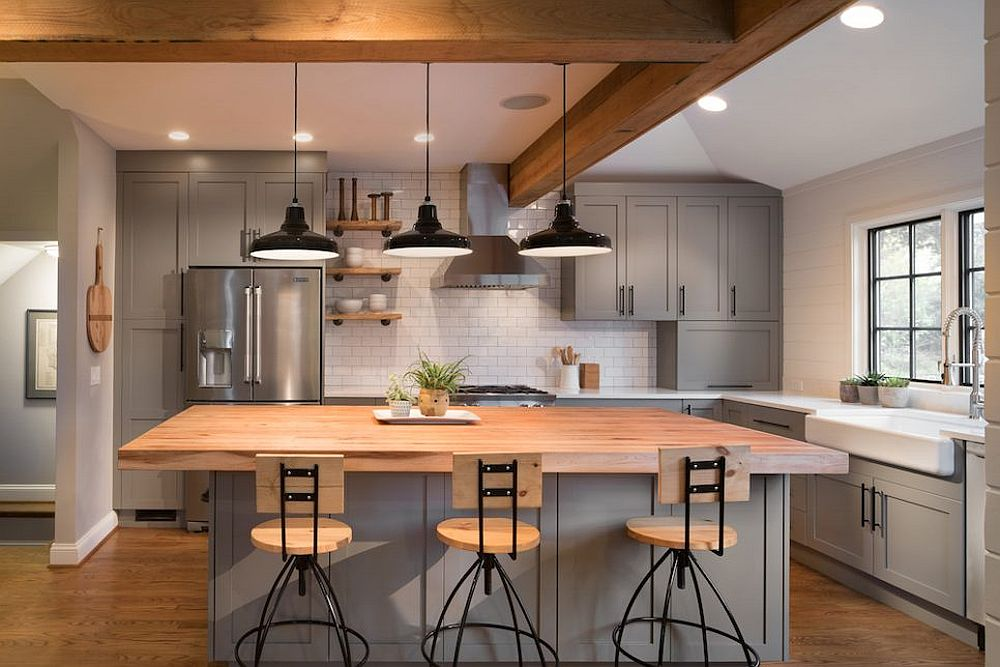 Mặt bàn gỗ cho nhà bếp nổi bật với màu xám và trắng.