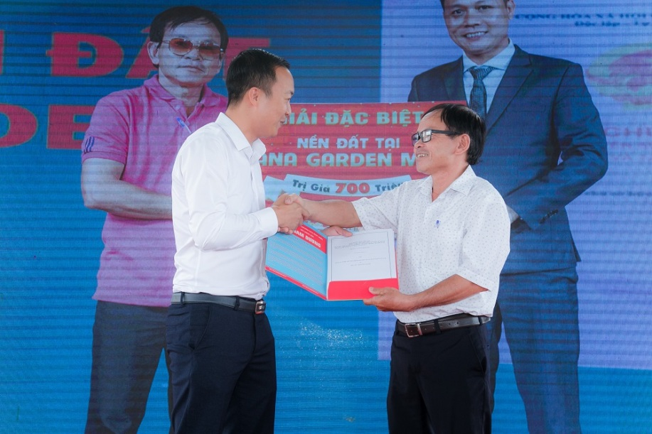 Đại diện chủ đầu tư trao giải đặc biệt là một nền đất trị giá 700 triệu đồng cho khách hàng may mắn nhất của chương trình khuyến mãi