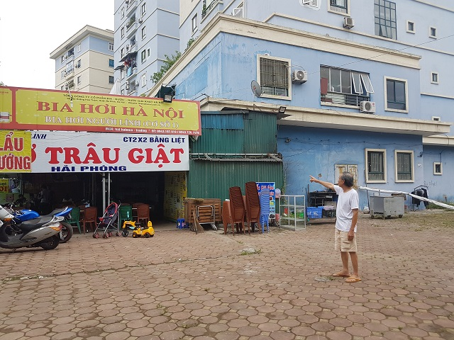 Chủ các quán hàng ăn này ngang nhiên san nền, lợp tôn, quây bạt thành những gian hàng kiên cố trên phần diện tích chung. Thậm chí, gian hàng mặt trước tòa nhà thường xuyên giết mổ gia cầm, đun than tổ ong gây khói bụi, hôi thối làm mất vệ sinh, ảnh hưởng đến người dân. Không chỉ ảnh hưởng tới vệ sinh môi trường, mỹ quan đô thị, những hàng quán này hoạt động đến 2 - 3 giờ sáng gây ồn ào và không đảm bảo an ninh trật tự cho cư dân. Ngoài ra, các hàng quán này do thiếu ý thức, xả thải bừa bãi thức ăn thừa, mỡ cặn xuống cống thoát nước xung quanh tòa nhà, cộng với việc đổ bê tông, xây bục bệ lấp miệng cống, không được khơi thông thường xuyên nên cứ mưa là nước thải lại dềnh lên gây ô nhiễm nặng nề.