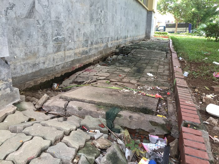Bậc thềm bị sụt thành những hầm hố, gạch lát bong tróc khiến không ai dám sử dụng
