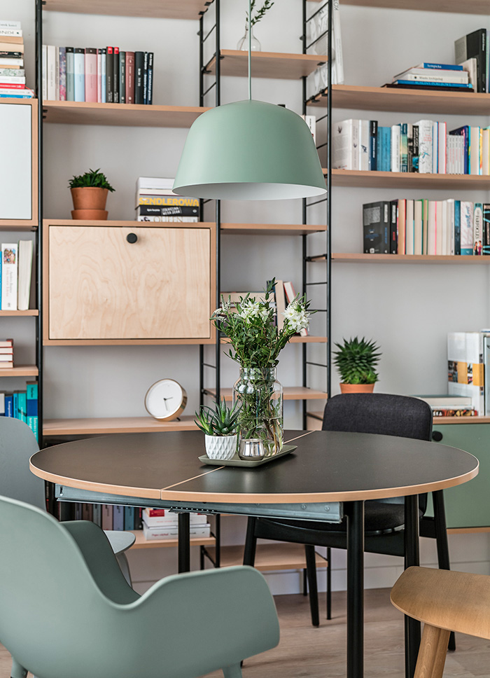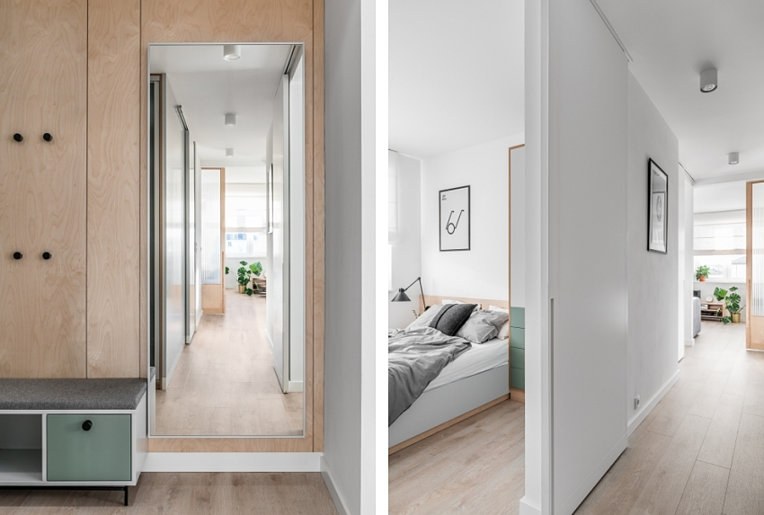 Nội thất được trang trí với màu xanh xám yên tĩnh, không gian sống tươi mát và dễ chịu thông qua màu sắc đơn giản và tinh khiết.