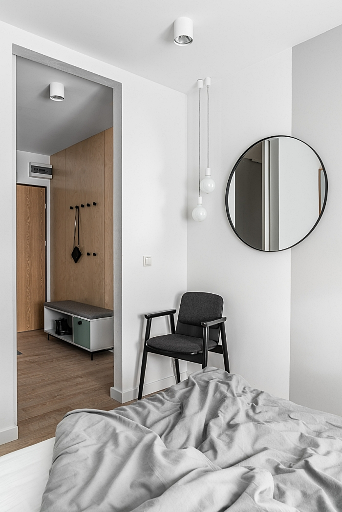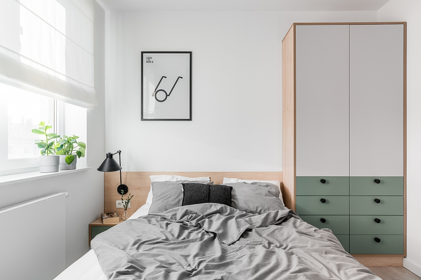 Toàn bộ căn phòng sử dụng tông màu trắng đơn giản làm nền, thông qua sàn gỗ ấm áp và trồng cây xanh trên cửa sổ, tạo nên bầu không khí tự nhiên và tự do.