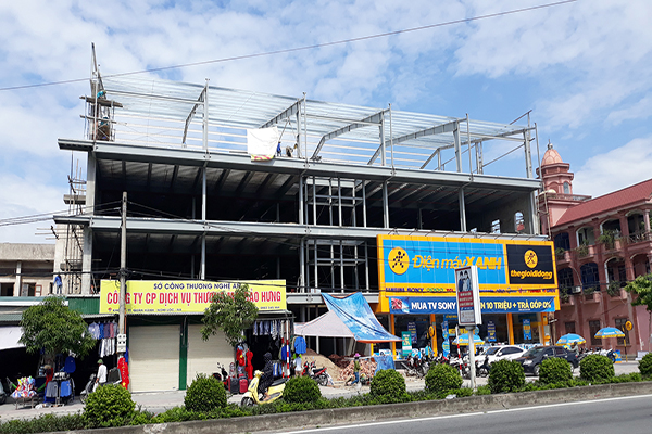 Những ngày gần đây, khi di chuyển trên QL 1A đoạn qua khối 4, thị trấn Quán Hành, huyện Nghi Lộc, Nghệ An, người đi đường có thể dễ dàng bắt gặp cảnh tượng dự án nói trên đang thi công dở dang nhưng phía dưới vẫn cho siêu thị “Điện máy xanh” hoạt động.