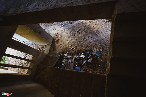 Bên trong những căn biệt thự bỏ hoang, rác thải nằm chất đống giữa nhà, kim tiêm vương vãi khắp nơi.